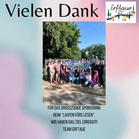 Bei unserem Sponsorenlauf "Laufen fürs Lesen" wurde das Lehrkraft Team-Erftaue vom Wiesenfest und von der Tombola der RockSommerNacht unterstützt. Wir haben weit mehr (auch mit Hilfe einiger Eltern) als 100 km zusammen erlaufen und freuen uns über 1000 € für neue Lektüren!